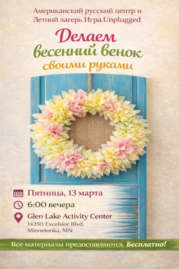 The American Russian Center, in collaboration with Игра.Unplugged Summer Camp, is happy to invite our community to another warm and creative spring workshop: making a beautiful decorative floral wreath by hand. This event offers a wonderful opportunity for children and adults alike to come together, create something meaningful, and celebrate the arrival of spring through art and tradition.